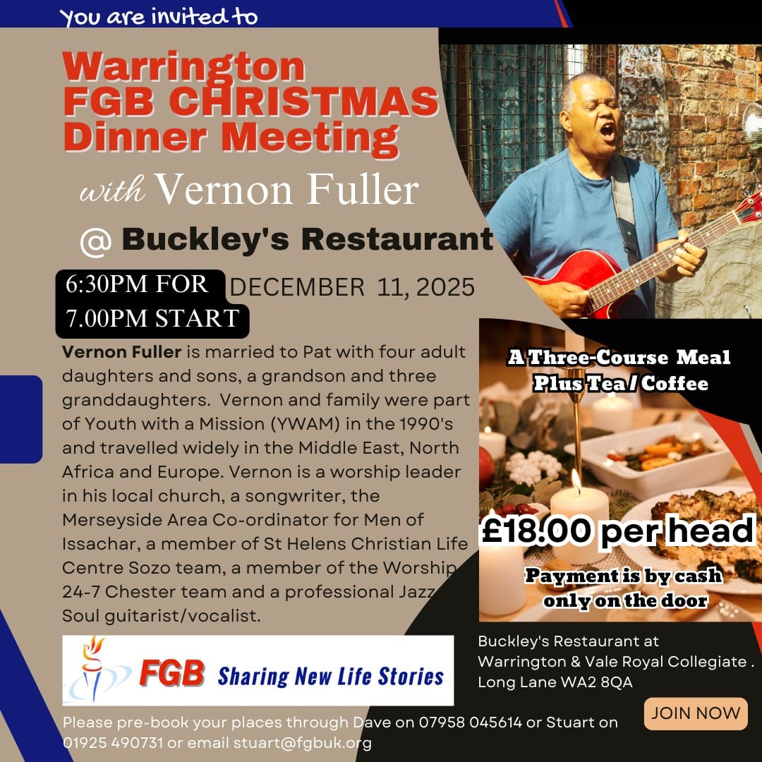 Visit www.fgbuk.org/after-dinner-speaker-videos to watch real life stories of previous speakers. Please pre-book your places for the Warrington FGB event through Dave on 07958 045614 or Stuart on 01925 490731 or stuart@fgbuk.org for a three course meal plus tea/coffee and of course the after-dinner speaker.
