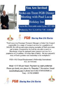 Join us for the Stoke-on-Trent Dinner at the Holiday Inn, with guest speaker Paul Lucas.